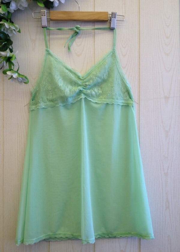 Женственная сорочка нежно-зеленого цвета. Лиф выполнен из мягкой кружевной ткани с цветочным рисунком. Спокойная сорочка без лишних деталей хорошо впишется в ночной гардероб.