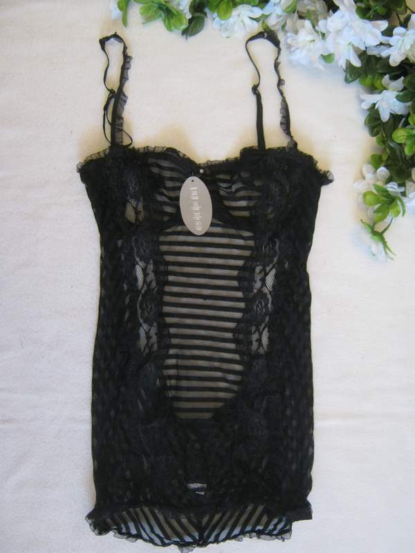 Полупрозрачная сорочка классического черного цвета с открытой спинкой подчеркивает все изгибы фигуры. Модель украшена рюшами и кружевом.
