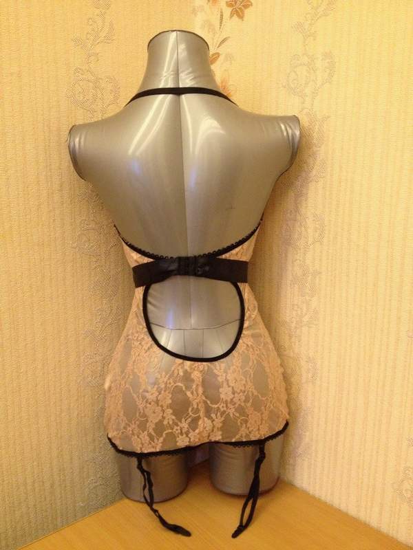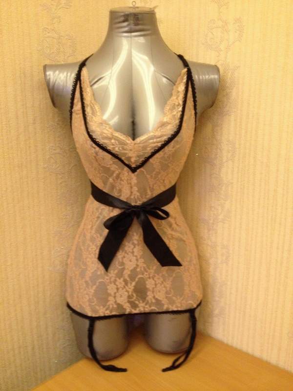 Мягкая сорочка с лямочкой через шею, подвязками для чулок. Сорочка облегает силуэт. Украшение-атласные ленты, которые завязываются спереди.