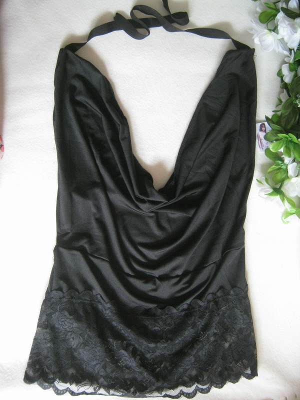 Короткая сорочка классического черного цвета украшенная широким кружевом по низу. Спинка сорочки максимально открыта, а изюминкой является вырез качели.