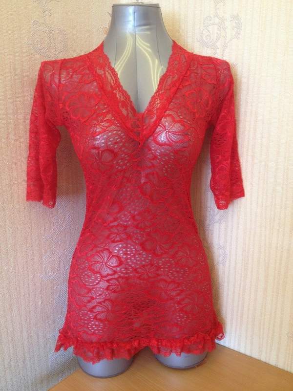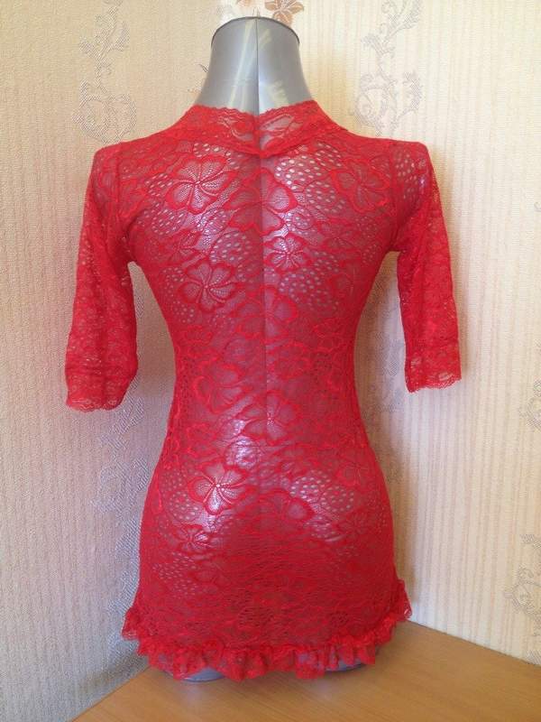 Мягкая однотонная сорочка сглубоким декольте из красного кружевного материала. Трусики в комплекте.