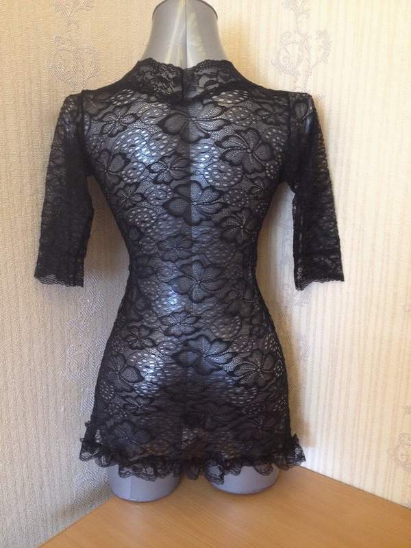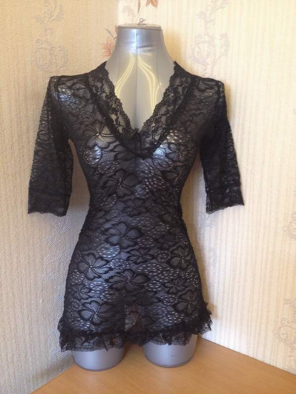 Мягкая однотонная сорочка сглубоким декольте из черного кружевного материала. Трусики в комплекте.