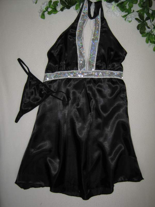Атласная сорочка с V-образвым вырезом, который украшен блестящими пайетками.
