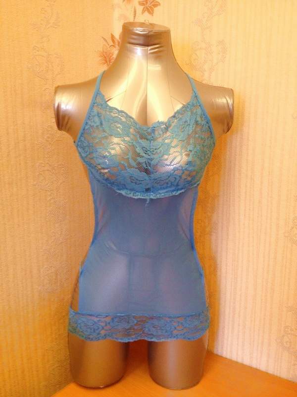 Сорочка нежно-голубого цвета с открытой спиной. Лиф и низ сорочки украшен кружевом.