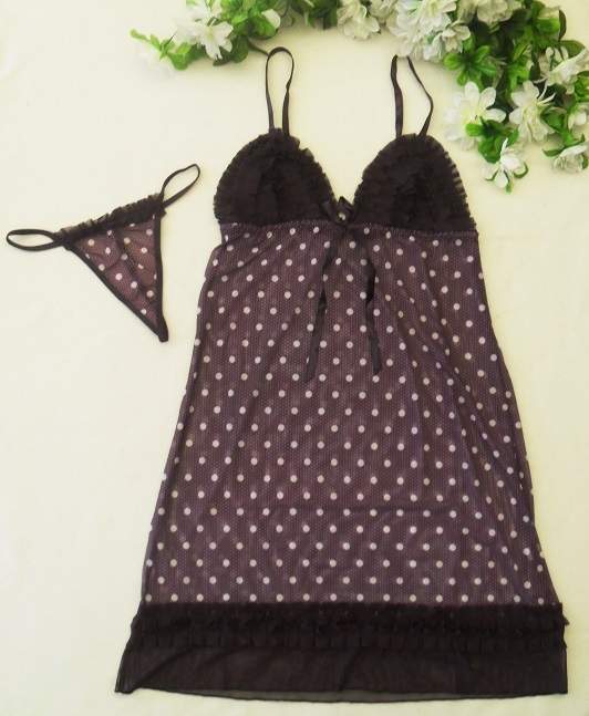 Сиреневая сорочка на регулируемых лямках с узором в белый горошек и рюшами. В комплект входят трусики-стринги.