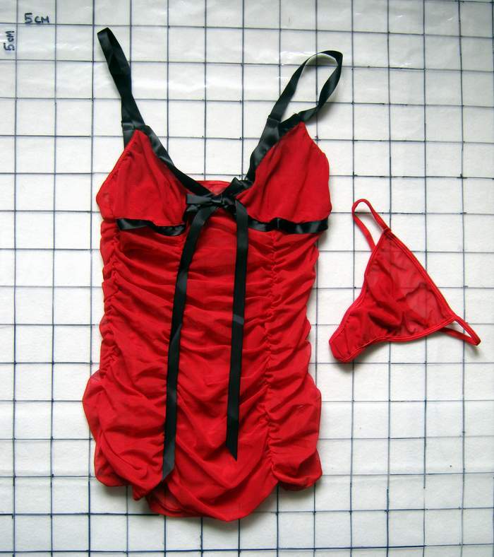 Красная сорочка из нежной сеточки, контрастно украшенная черной атласной лентой. Трусики-стринги в комплекте