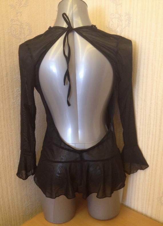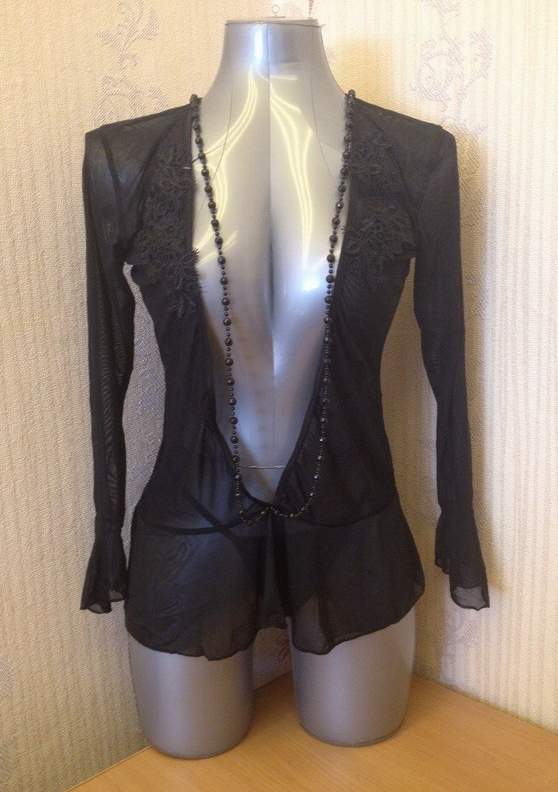 Эротическая полупрозрачная сорочка с глубоким вырезом спереди и открытой спиной. Вырез украшен ниткой бусин