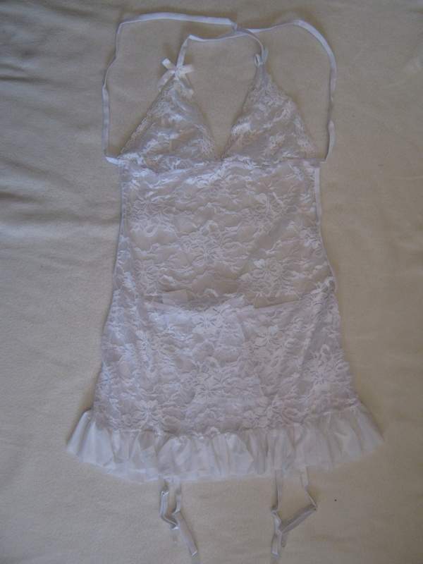 Белая кружевная сорочка с перекрещивающимися лямочками на спине. Лиф сорочки украшен мягкой тесьмой, подол - рюшами.