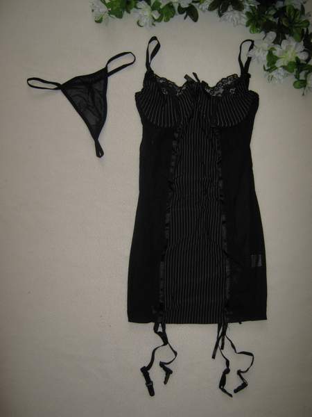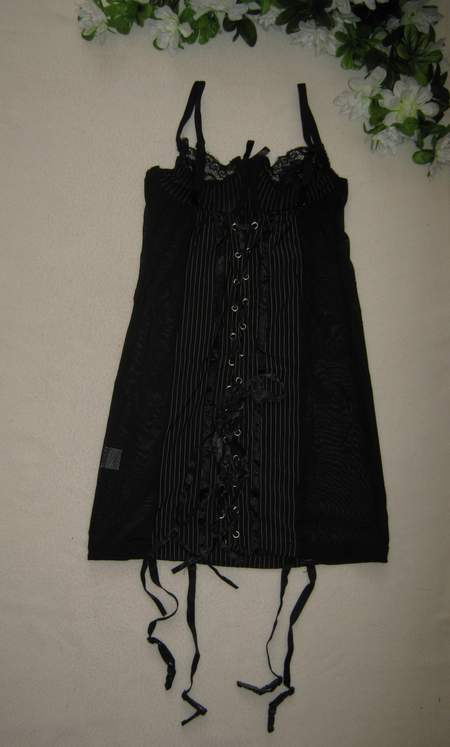 Короткая сорочка, выполненная из ткани в классическую офисную полоску, с несъемными подвязками для чулок. Украшена шнуровкой сзади и полупрозрачными вставками по бокам.