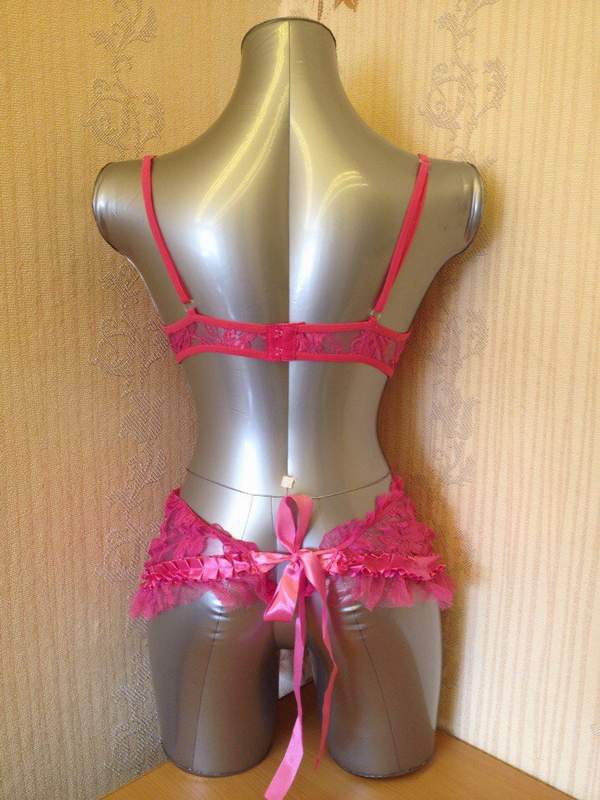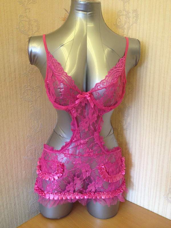 Кружевная ярко-розовая сорочка с лифом на косточках выполнена в виде фартучка.