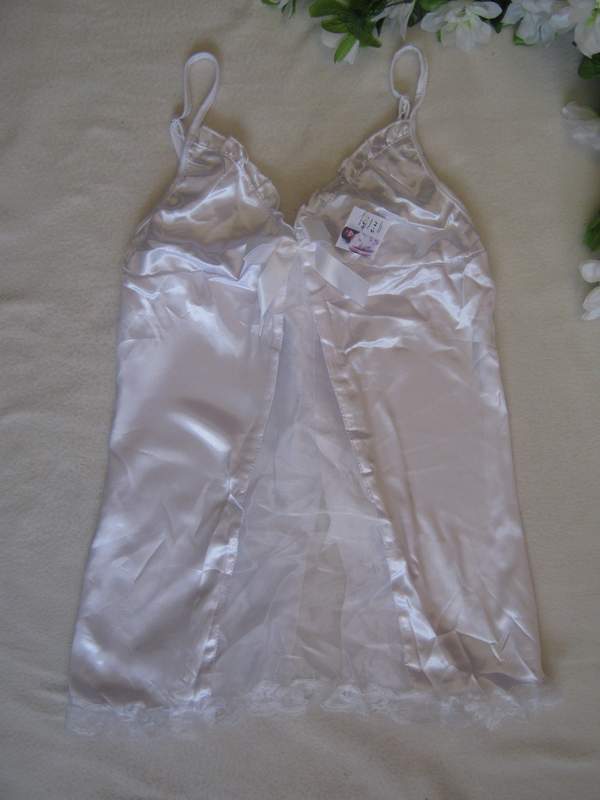 В этот белоснежный комплект входит сорочка и трусики-стринги. Сорочка выполнена в стиле беби-долл и завязывается сзади атласными лентами. Изюминкой является прозрачная вставка спереди. Подол сорочки окаймлен кружевом.