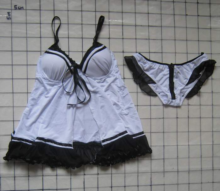 Элегантная черно-белая сорочка, открывающая животик. Сорочка с чашечками примерно 2 размера. В комплекте трусики с шифоновыми рюшами и пикантным разрезом спереди.