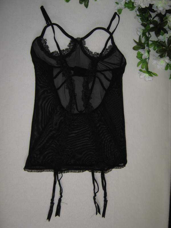Полупрозрачная сорочка с открытой грудью украшена кружевом с интересным рисунком.