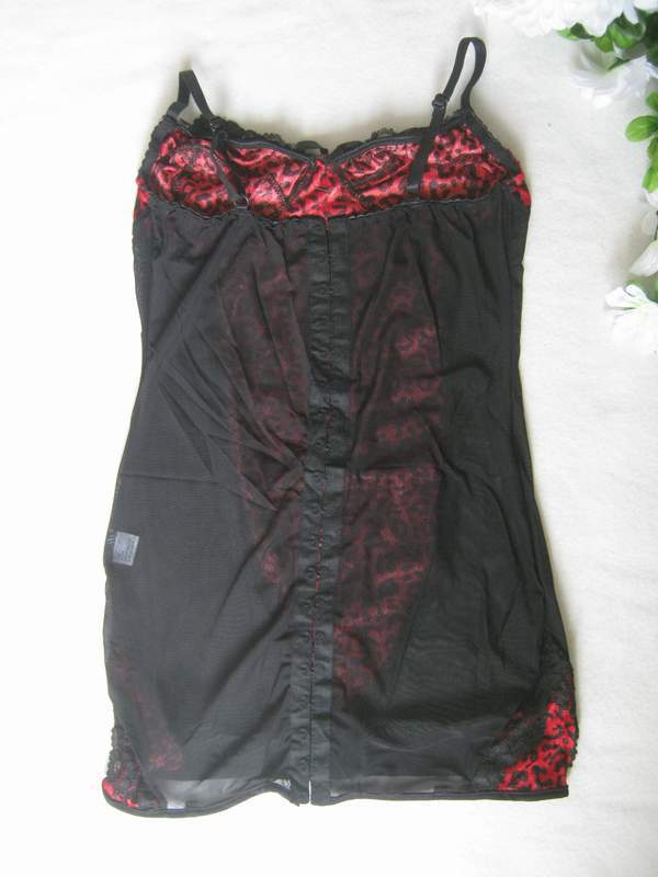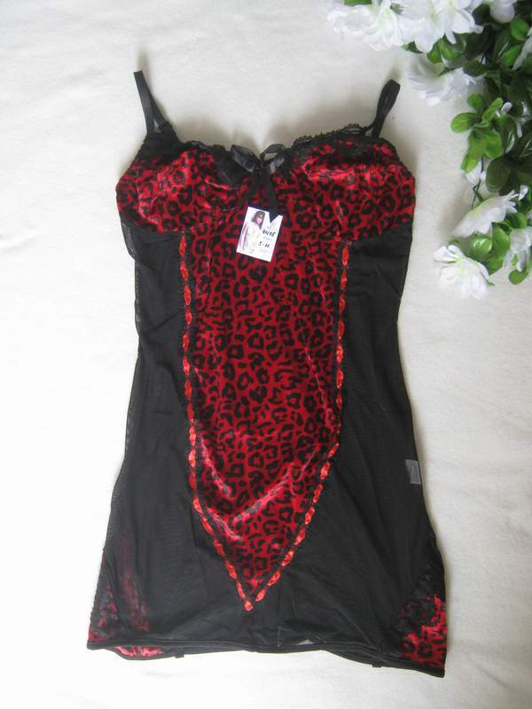 Короткая соблазнительная сорочка из тонкого эластичного материала. Ярким декором является красный леопардовый принт. Лиф сорочки украшен кружевом.