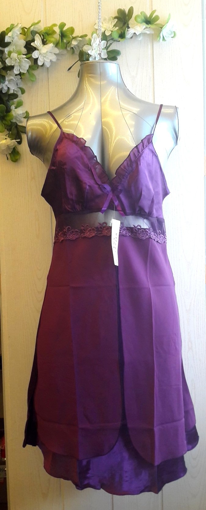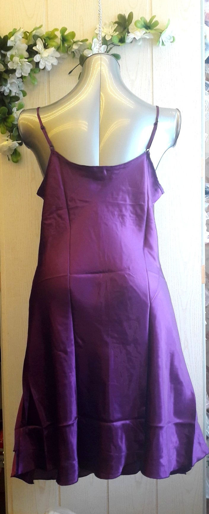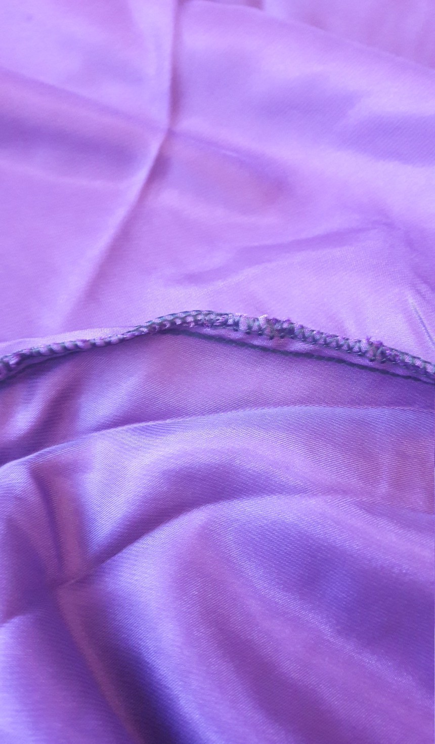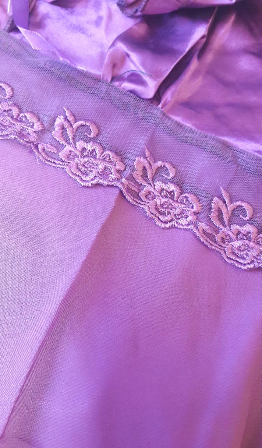 Сорочка сиреневого цвета выполнена из двух видов тканей: снизу атлас, сверху шифон. Сорочка не тянется. Фотографии сорочки, предоставлены на манекене 90-60-90.