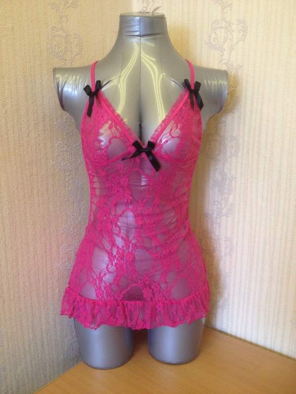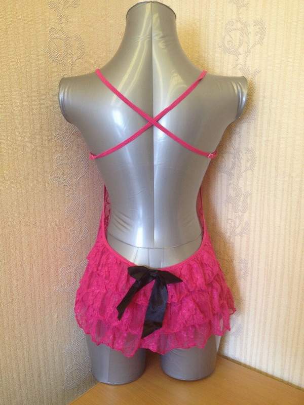Сорочка с открытой спиной выполнена из мягкого цветочного кружева. Украшена контрастными бантиками, сзадимногослойная юбочка.