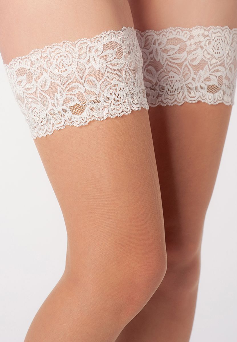 Классические телесные гладкие чулки плотностью 20 den с белой кружевной резинкой шириной 9 см и с двойной силиконовой поддержкой. Укрепленный прозрачный мысок.