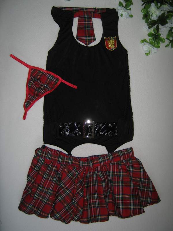 Комплект состоит из эластичного черного топа и юбочки в клетку.