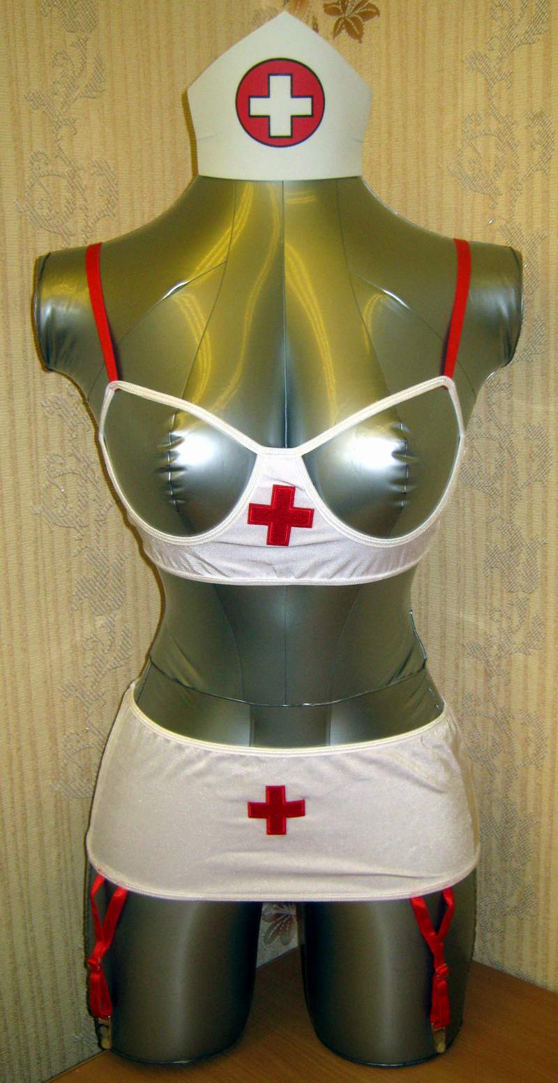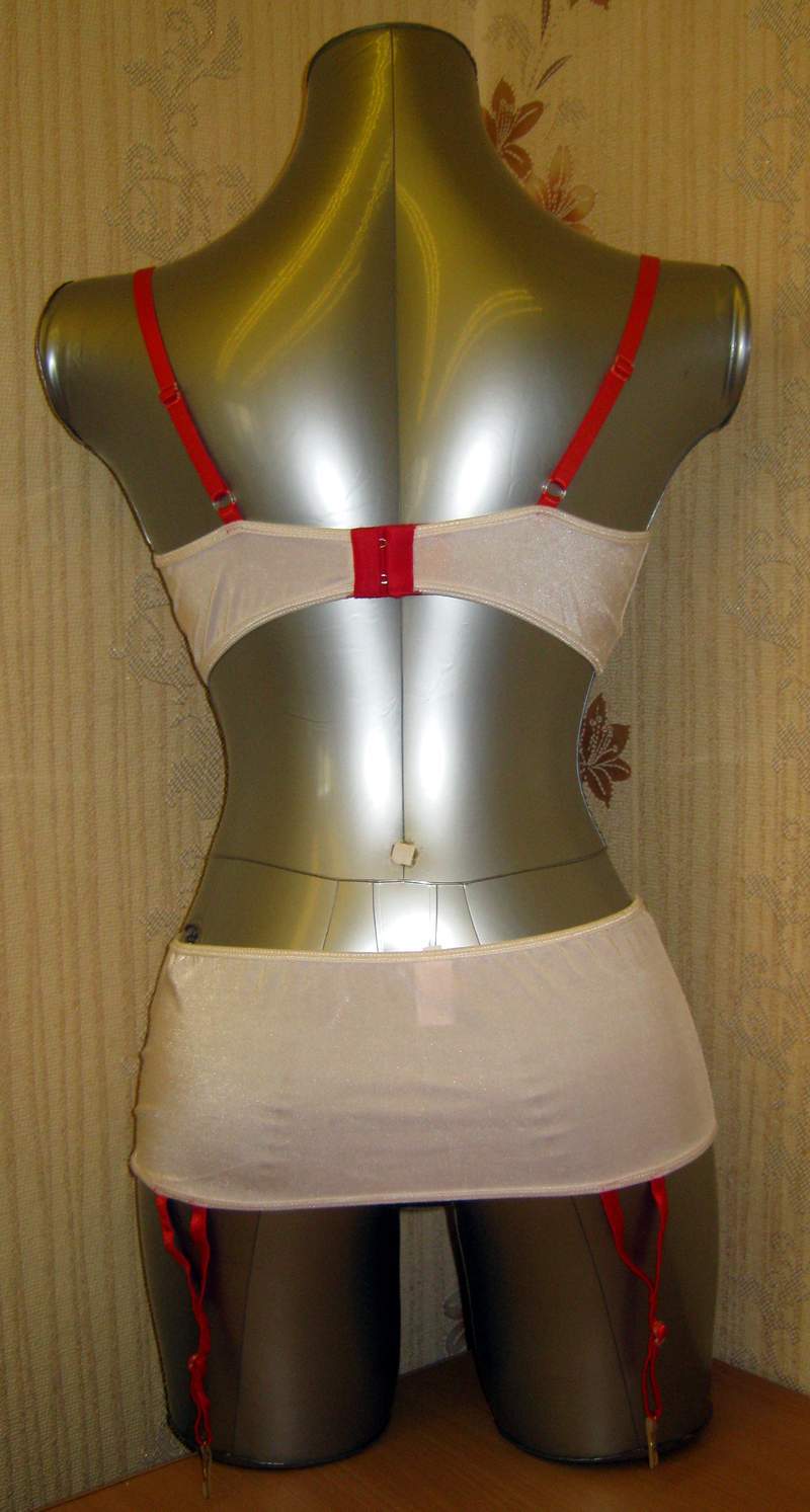 Комплект выполнен из эластичной белой ткани. Топ с открытой грудью продемонстрирует все ваши прелести, юбка с подвязками для чулок.