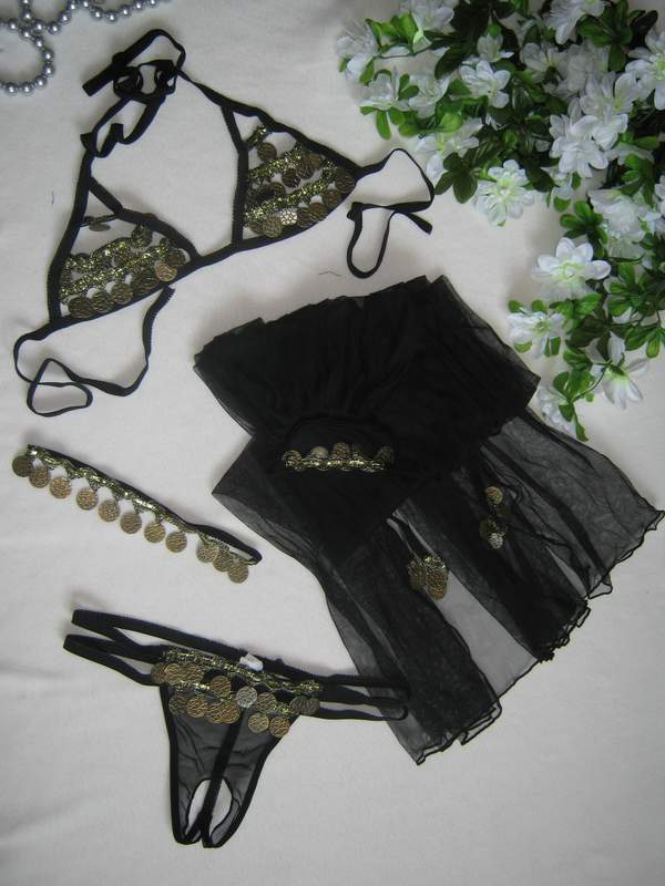 Костюм танцовщицы Востока, украшенный монетами состоит из 4 предметов: лифа, открывающего грудь; трусиков с пикантным разрезом; колье из монет на шею и вуаль, крепящаяся на голову с несьемными браслетами на руки.