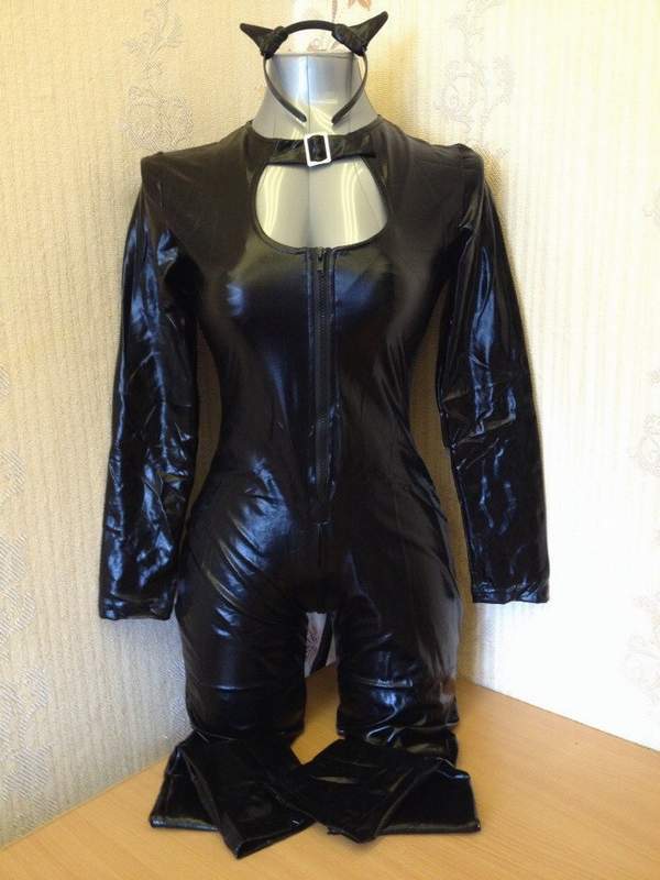 Соблазнительный комбинезон кошечки черного цвета с хвостом. Комбинезон спереди на молнии. Ушки в комплекте.