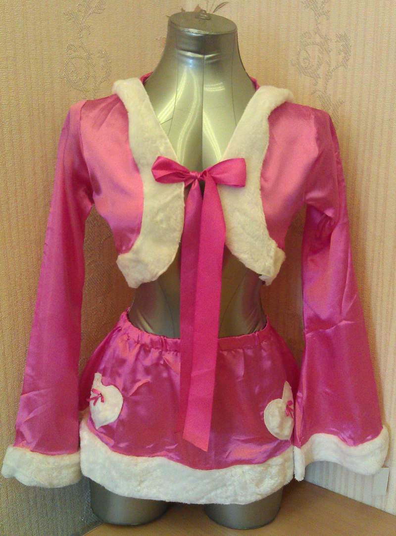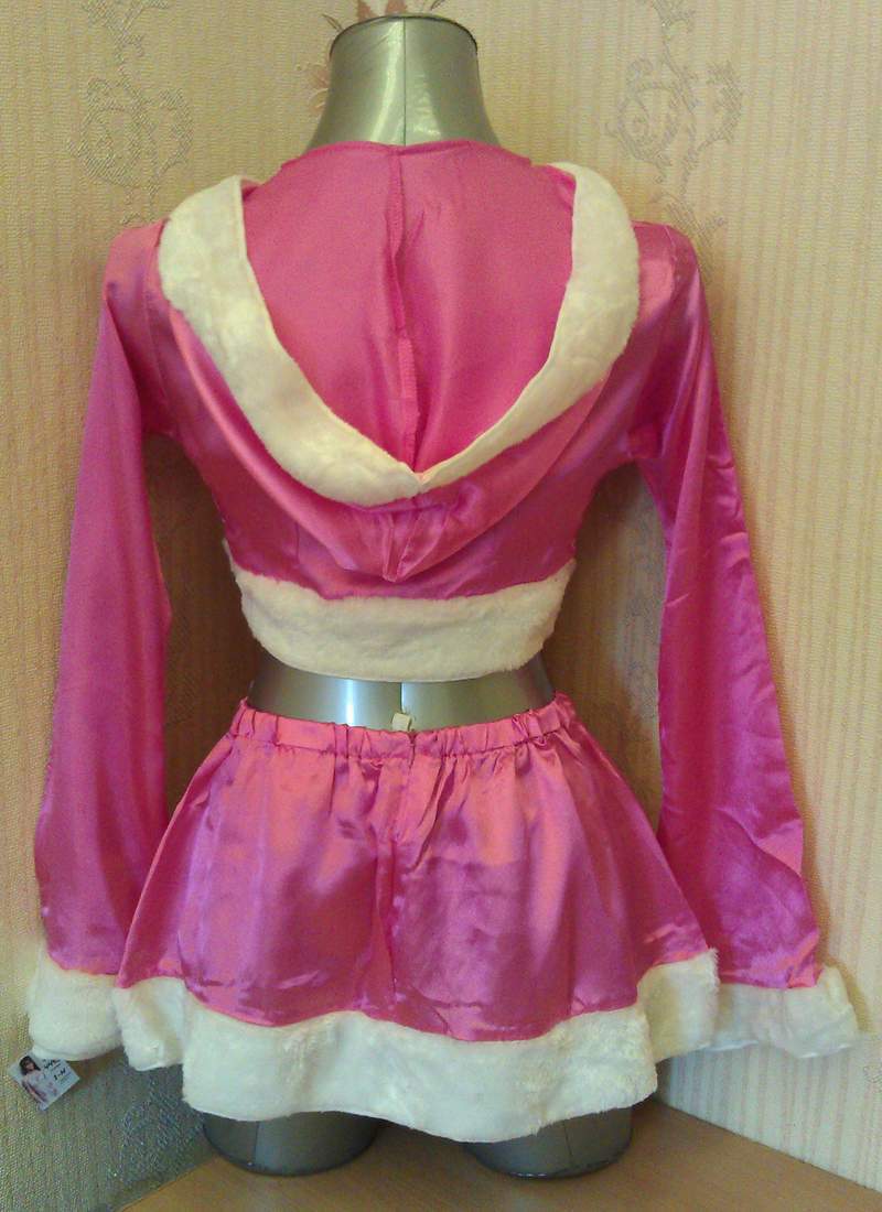 Костюм выполнен из розовой атласной ткани. Жакет с капюшоном и юбочка по краю декорированы белым искусственным мехом.
