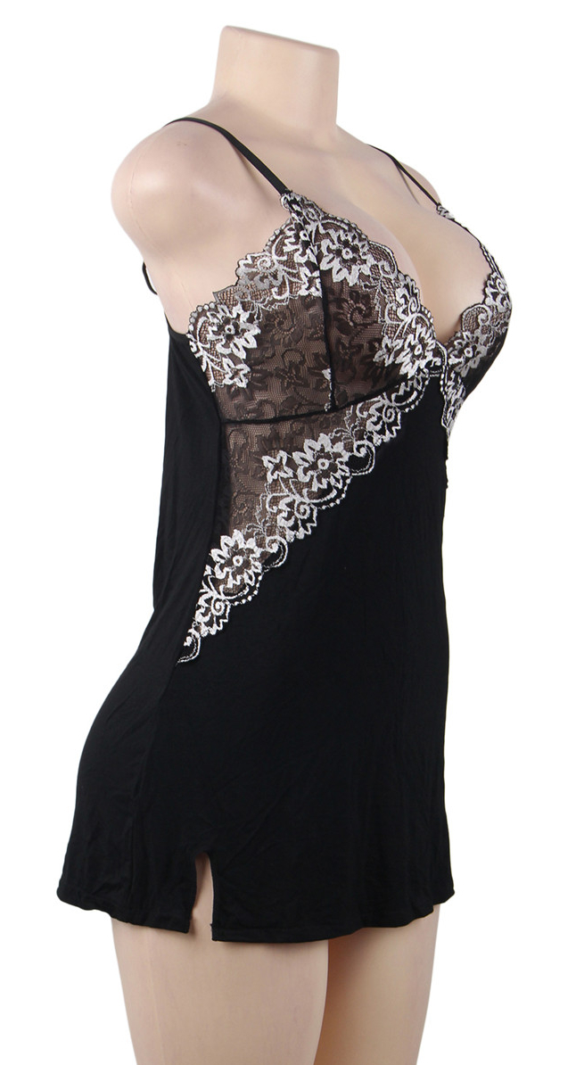 Трикотажная сорочка черного цвета со светлым кружевом в области груди. Очень приятная к телу. Мягкий лиф без косточек, бретели регулируются по длине.