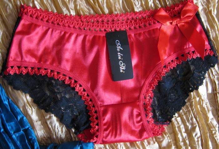 Милые трусики-слип из ярко-красного трикотажа. Сзади украшены мягким черным кружевом, а спереди очаровательным бантиком.