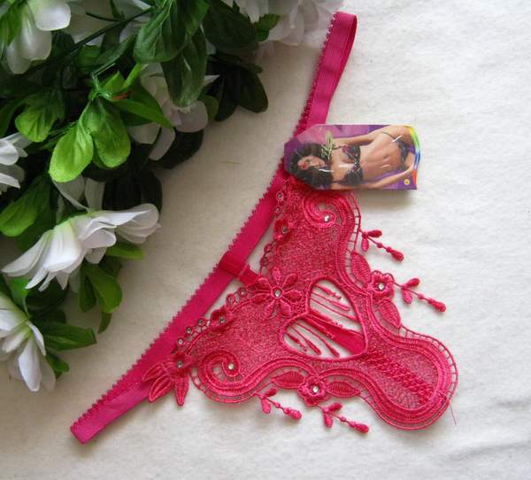 Пикантные трусики-стринги из плотного кружева затейливого узора, украшенные стразами.