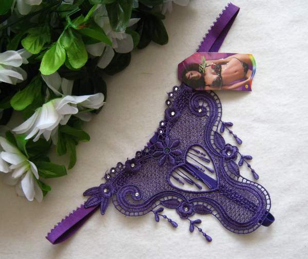 Пикантные трусики-стринги из плотного кружева затейливого узора, украшенные стразами.