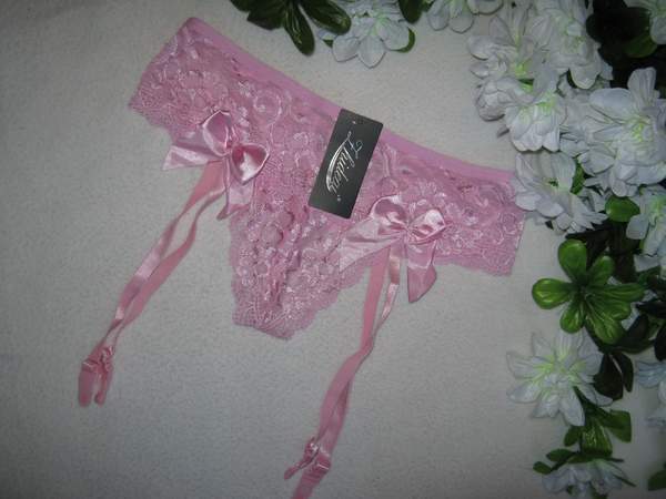 Трусики-стринги нежно-розового цвета с подвязками для чулок.