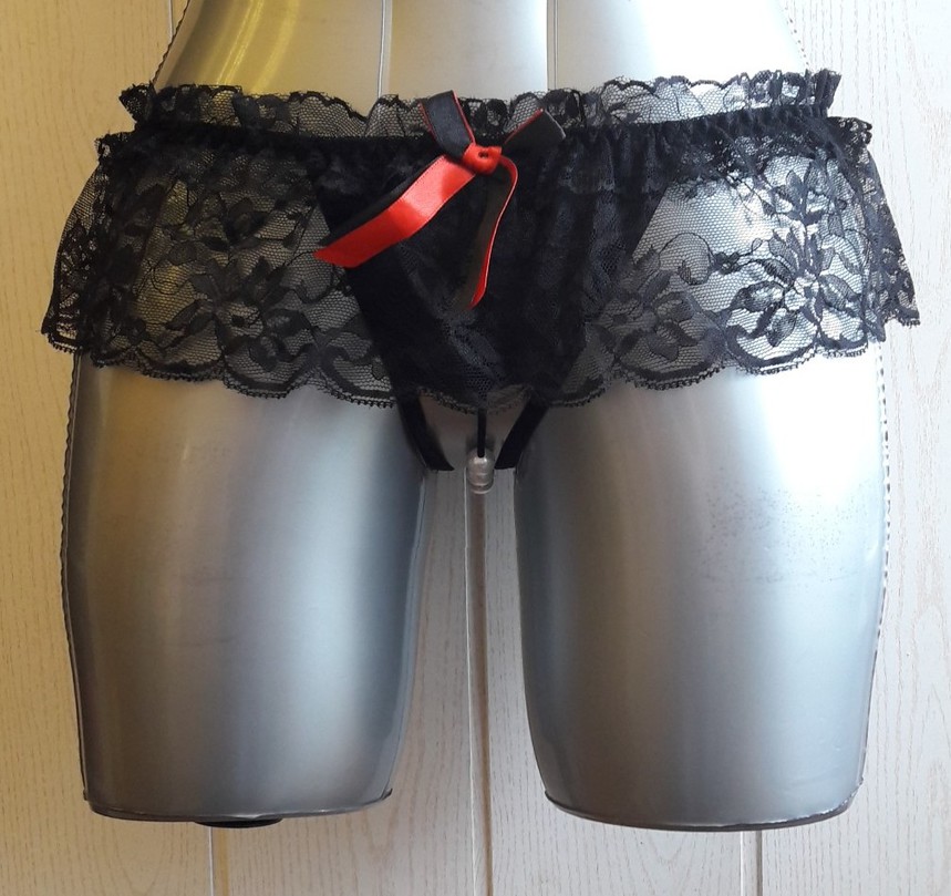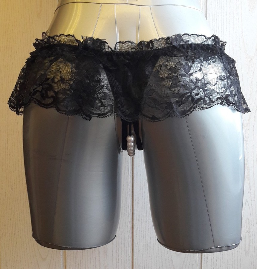 Трусики выполнены из кружева черного цвета. Интимная зона промежности оставлена открытой и украшена ниткой бусин диаметром 12 мм