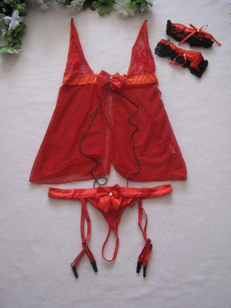 Сорочка с разрезами сзади и спереди, декорирована ниткой со стразами и атласными бантиками. В комплект входит пояс с подвязками для чулок и подвязки на ноги.
