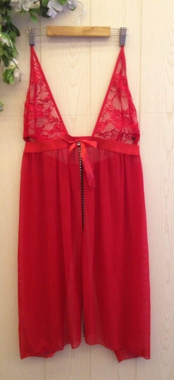 Сорочка с разрезами сзади и спереди, декорирована ниткой со стразами и атласными бантиками. В комплект входит пояс с подвязками для чулок и подвязки на ноги.