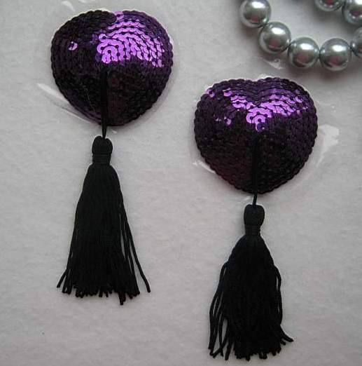 Гламурные наклейки на грудь в форме сердечек из пайеток фиолетого цвета, украшенные кистями.
