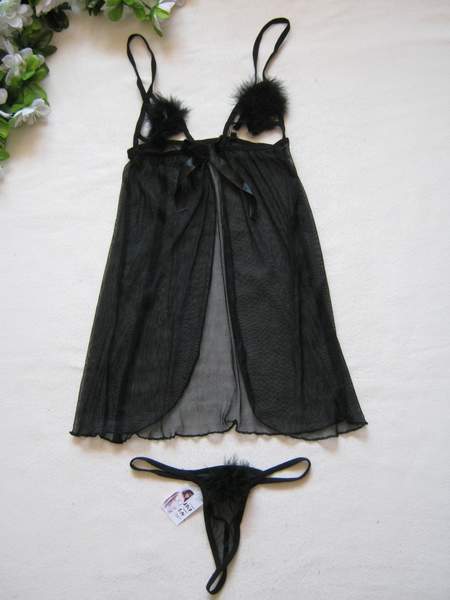 Эротическая сорочка с вертикальным разрезом. Полуоткрытая грудь украшена пухом марабу. Лямки регулируются по длине. Трусики-стринги в комплекте