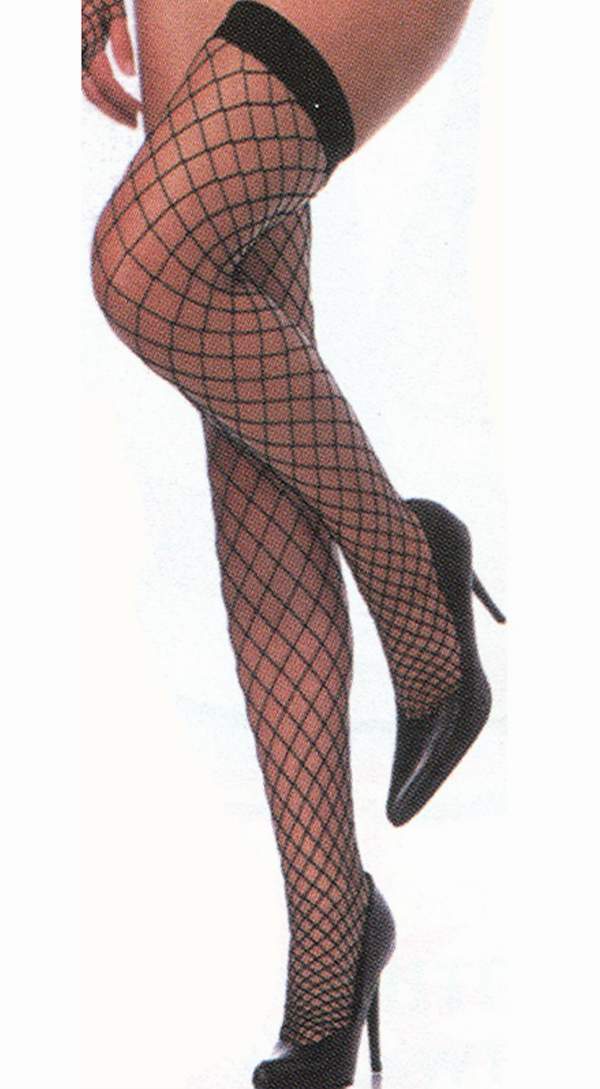 Черные чулки в крупную сетку с узкой гладкой удерживающей резинкой.