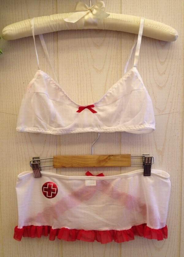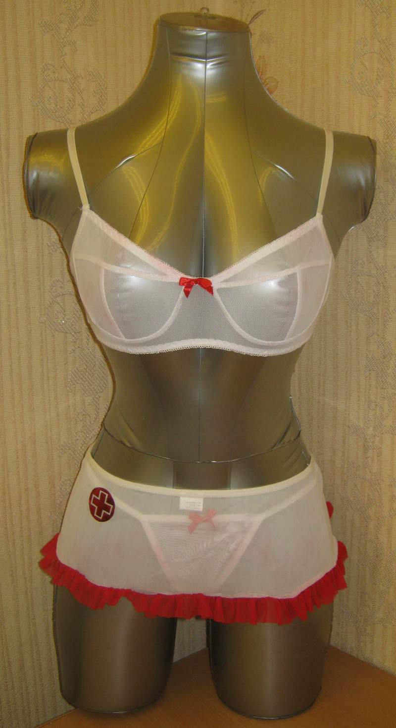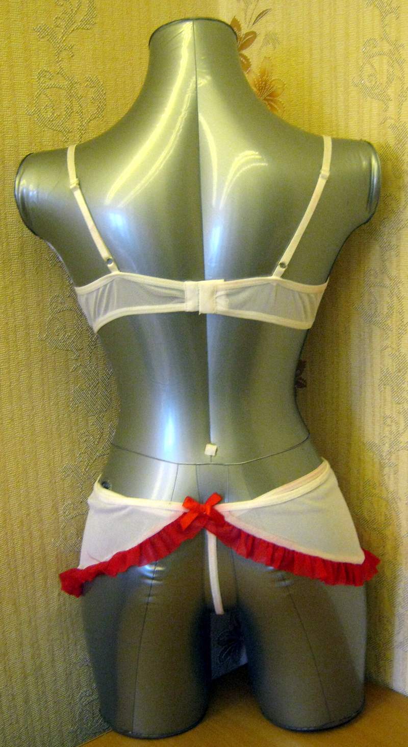 В комплекте белый лиф с красным бантиком, мини юбочка, обнажающая ягодицы, и трусики.