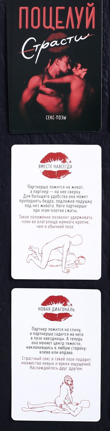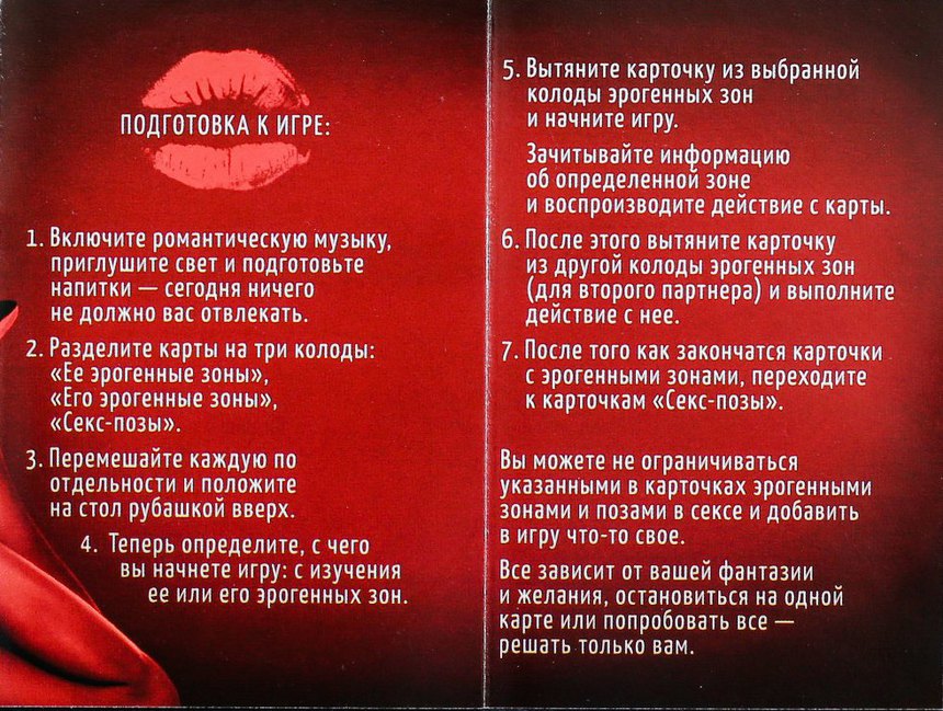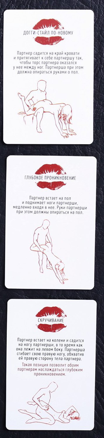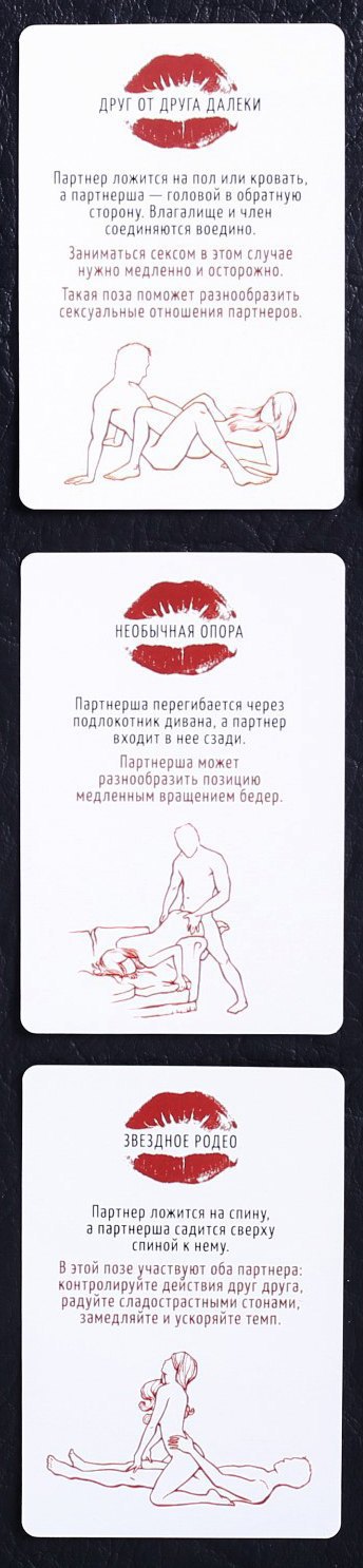 После этого вытяните карточку для второго партнёра и выполните то, что написано на ней. После переходите к карточкам «Позы».