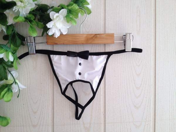 Белые соблазнительные стринги-стринги с черным бантоком и стразиками. Такие трусики с открытой промежностью-отличный подарок для любимого мужчины.