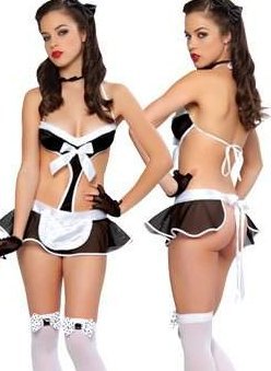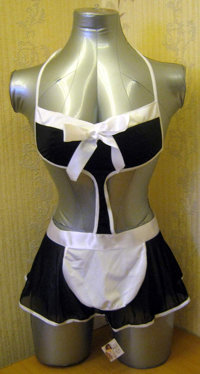 Эротичский костюм выполнен в виде монокини с юбочкой и фартуком. По бокам имеются вырезы.