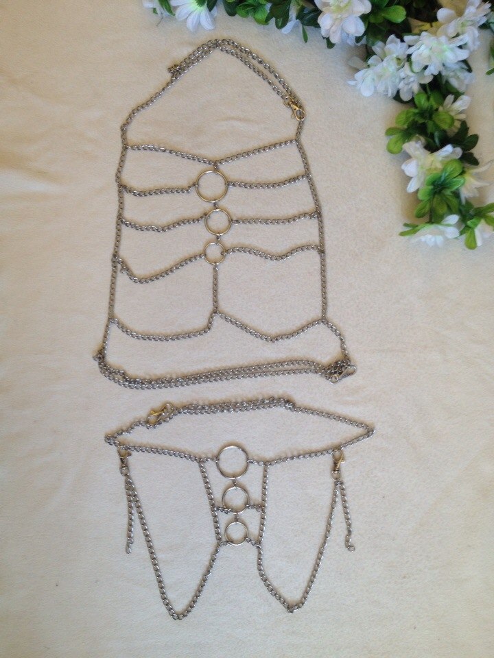 Экзотический комплект состоит из трусиков и лифа, которые выполнены в виде цепочек, соединяющихся между собой карабинами.