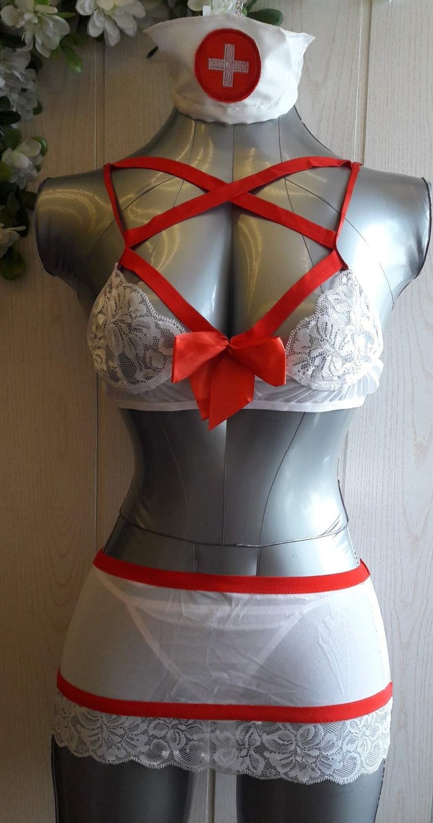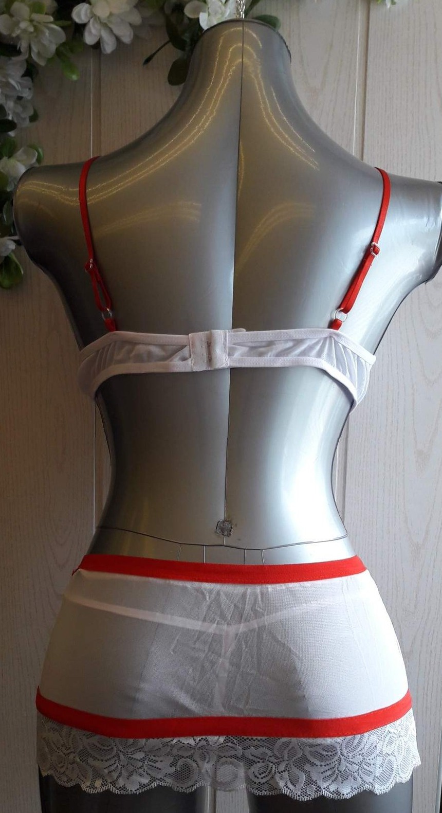 Соблазнительный комплект для создания образа медсестры состоит из лифа (рекомендуется на болшую грудь) и юбочки, выполненных из белой микросетки с контрастной красной отделкой. Прекрасно дополняют образ идущие в комплете трусики-стринги из того же материала и чепчик на ободке.