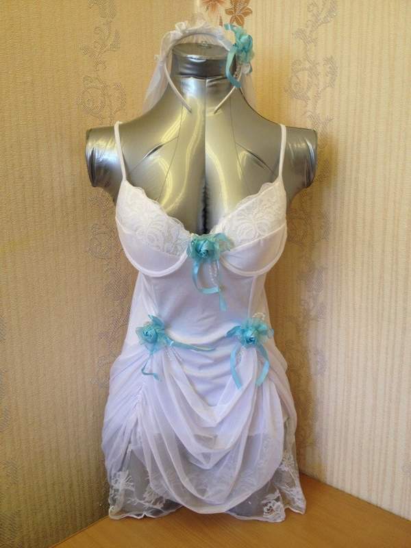 Сексуальный комплект невесты белого цвета украшен милыми цветочками голубого цвета.