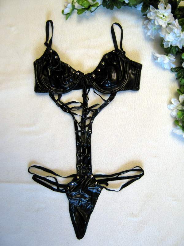 Сексуальное виниловое боди декорировано шнуровкой и клепками, лиф на косточках.