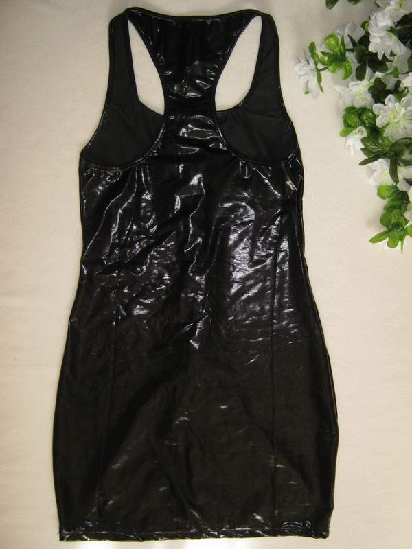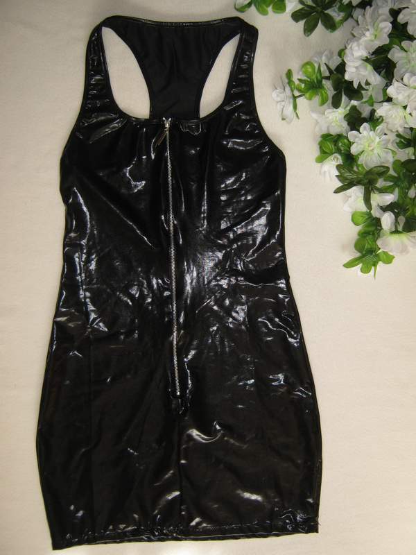 Короткое сексуальное платье из аналога винила с застежкой-молнией спереди.
