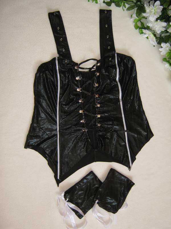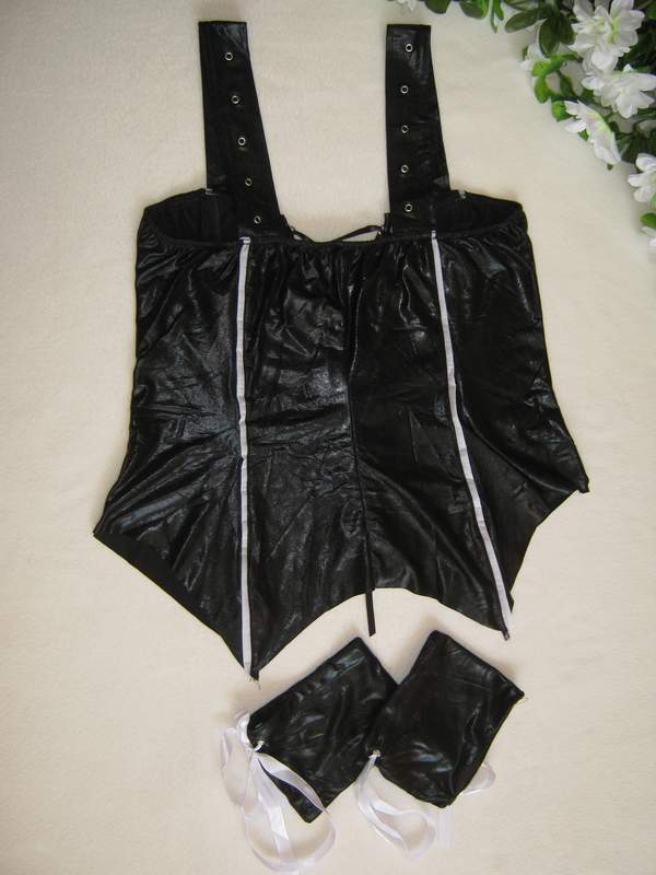 Платье выполенено из эластичного белого материала. Жилетка, имитирующая винил, на шнуровке.