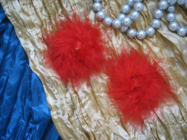 Игривые пэстис из красных пайеток, украшенные пухом марабу.