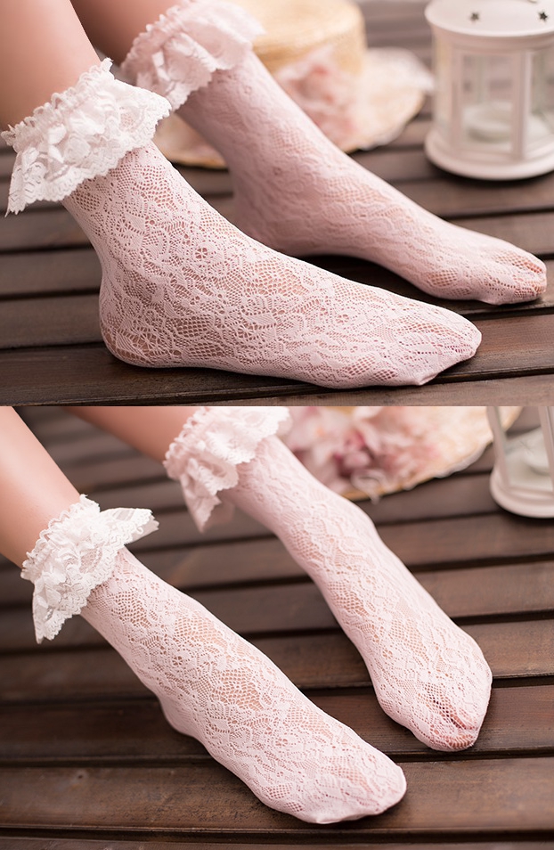 Белые носочки выполнены в технике чулочной вязки с цветочным узором. Верхний край украшен мягким кружевом. Станут отличным дополнением к эротическому костюму студентки или школьницы