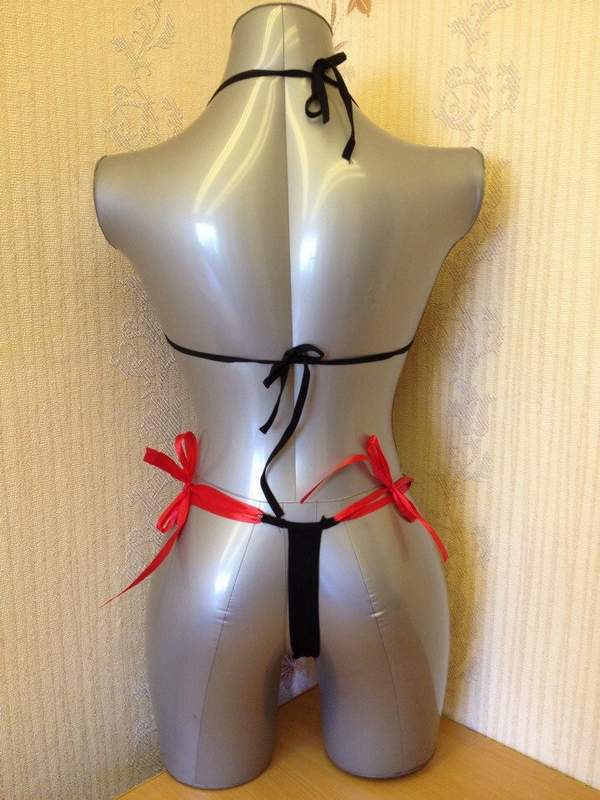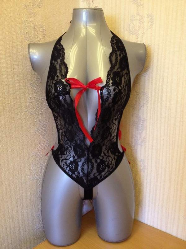 Черное кружевное боди с оригинальным цветочным рисунком завязывается тонкими контрастными лентами.